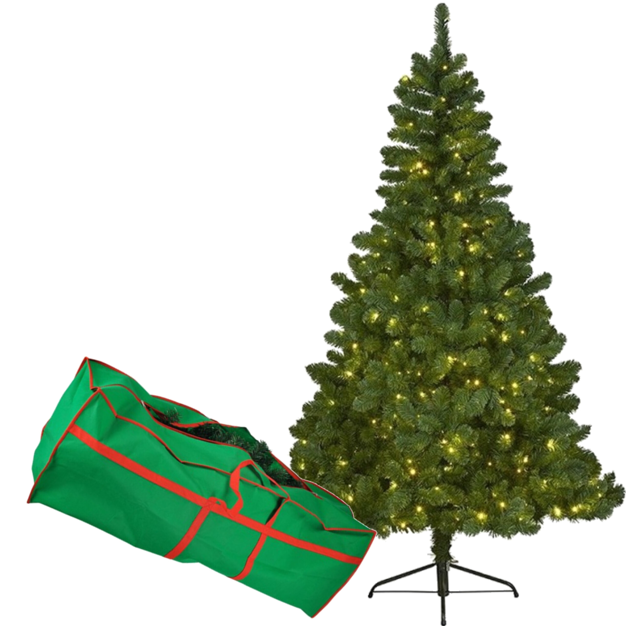 Kunst kerstboom/dennenboom met 110 kerstlampjes klein formaat 120 cm + opbergtas van 120 x 25 x 23 cm. De boom past nooit meer terug in de doos, vandaar de handige opbergtas. Kerstboompje met ongeveer 220 plooitakken met zachte naalden, een diameter van ca. 80 cm en een metalen voet. Het opzetten van de kerstboom is eenvoudig door het paraplu systeem, waarbij je alleen de takjes nog in model hoeft te brengen. Materiaal: PVC/metaal. Formaat: 80 x 120 cm. Kleur: groen. , Dit artikel bestaat uit:, 1x Kunst kerstboom Imperial Pine met verlichting 120 cm , 1x Kerstboom opbergzak/opbergtas – groen/rood – voor kerstboom tot 210 cm – opruimen