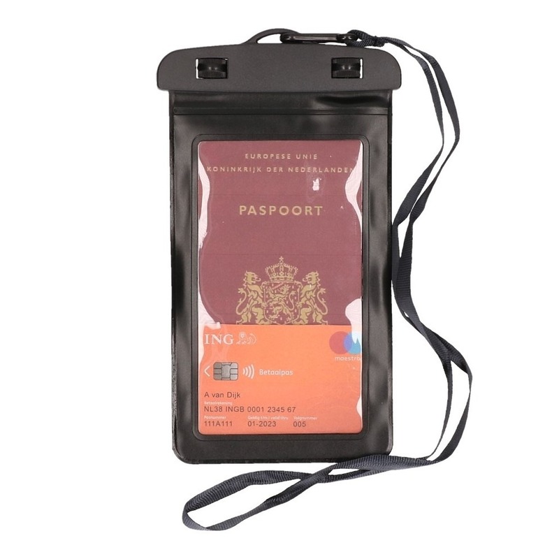 Waterdicht documententasje/ waardvolle spullen hoesje zwart. Handig hoesje om uw paspoort, pinpas of andere waardevolle spullen droog of stofvrij te houden. Formaat 10.5×17.5 cm met keycord. Let op: Test de waterdichtheid voor gebruik, bijvoorbeeld met een stuk papier. Waterdicht reistasje, documententasje voor op vakantie, reisdocumenten hoesje voor op reis, veiligheidstasje voor waardevolle nektasje documenten.