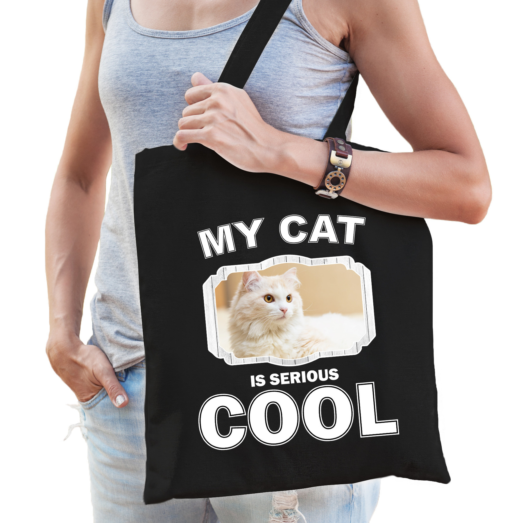 Witte kat katten tasje zwart volwassenen en kinderen. Op deze tas staat een Witte katten afbeelding en de tekst: my cat is serious cool. Een musthave voor een echte dieren/ katten liefhebber of iemand die alles van poezen spaart. Erg leuk om cadeau te doen aan een echte katten fan of gewoon om zelf te gebruiken!