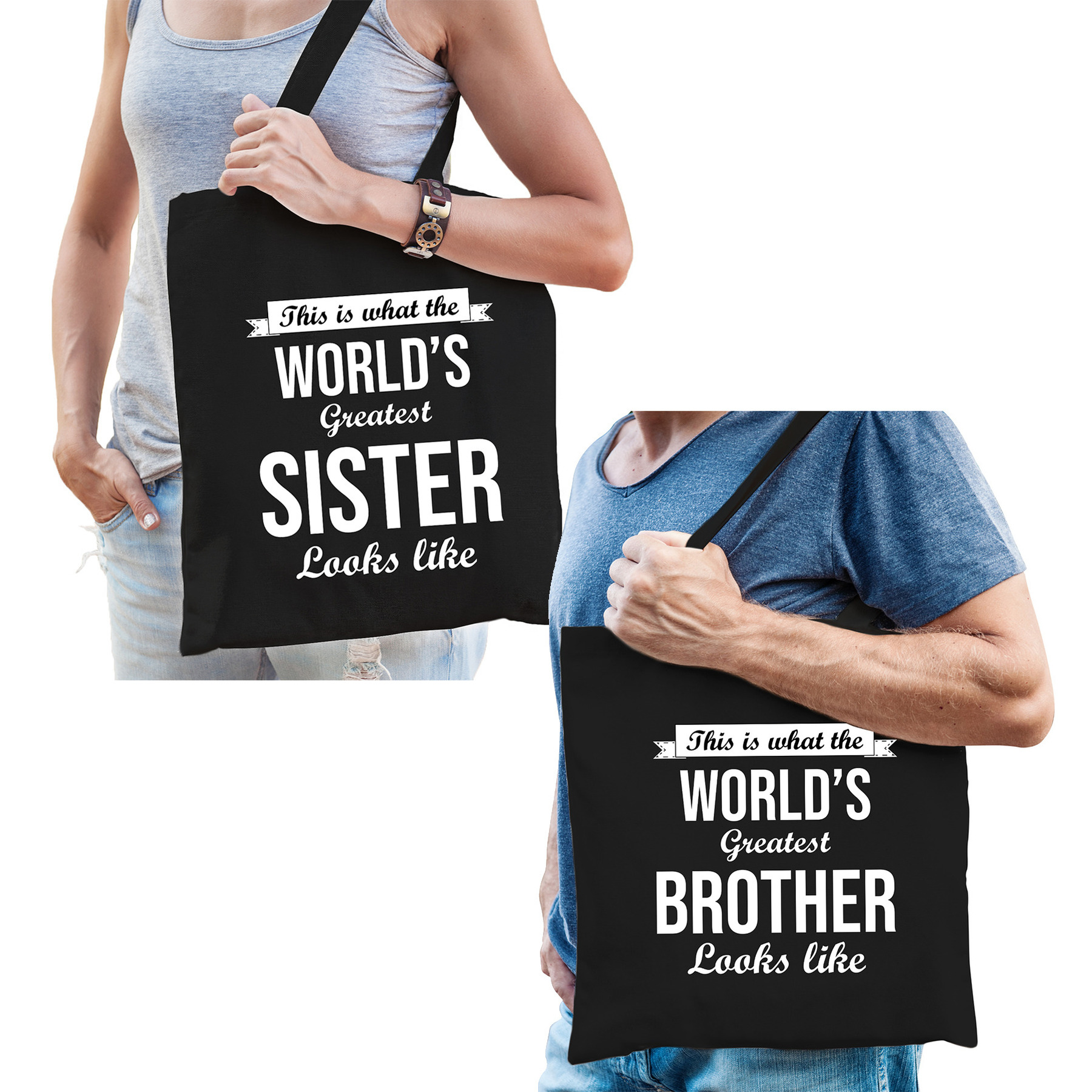 Worlds greatest Brother en Sister tasje zwart – Cadeau tassen set voor Broer en Zus. Katoenen tasjes cadeau set voor Broer en Zus, bestaande uit 2 tassen uit dezelfde serie. Een leuke boodschappen tas voor je Zus en voor je Broer! Koop in 1 keer een cadeau voor hun verjaardagen of gewoon omdat ze de beste Broer en Zus zijn. Formaat vak: 42 x 38 cm. Totale lengte inclusief hengsel: 67 cm. Materiaal: 100% katoen, 140 grams kwaliteit. Inhoud: 10 liter. , Dit artikel bestaat uit:, 1x Worlds greatest SISTER zus cadeau tas zwart voor dames, 1x Worlds greatest BROTHER broer cadeau tas zwart voor heren