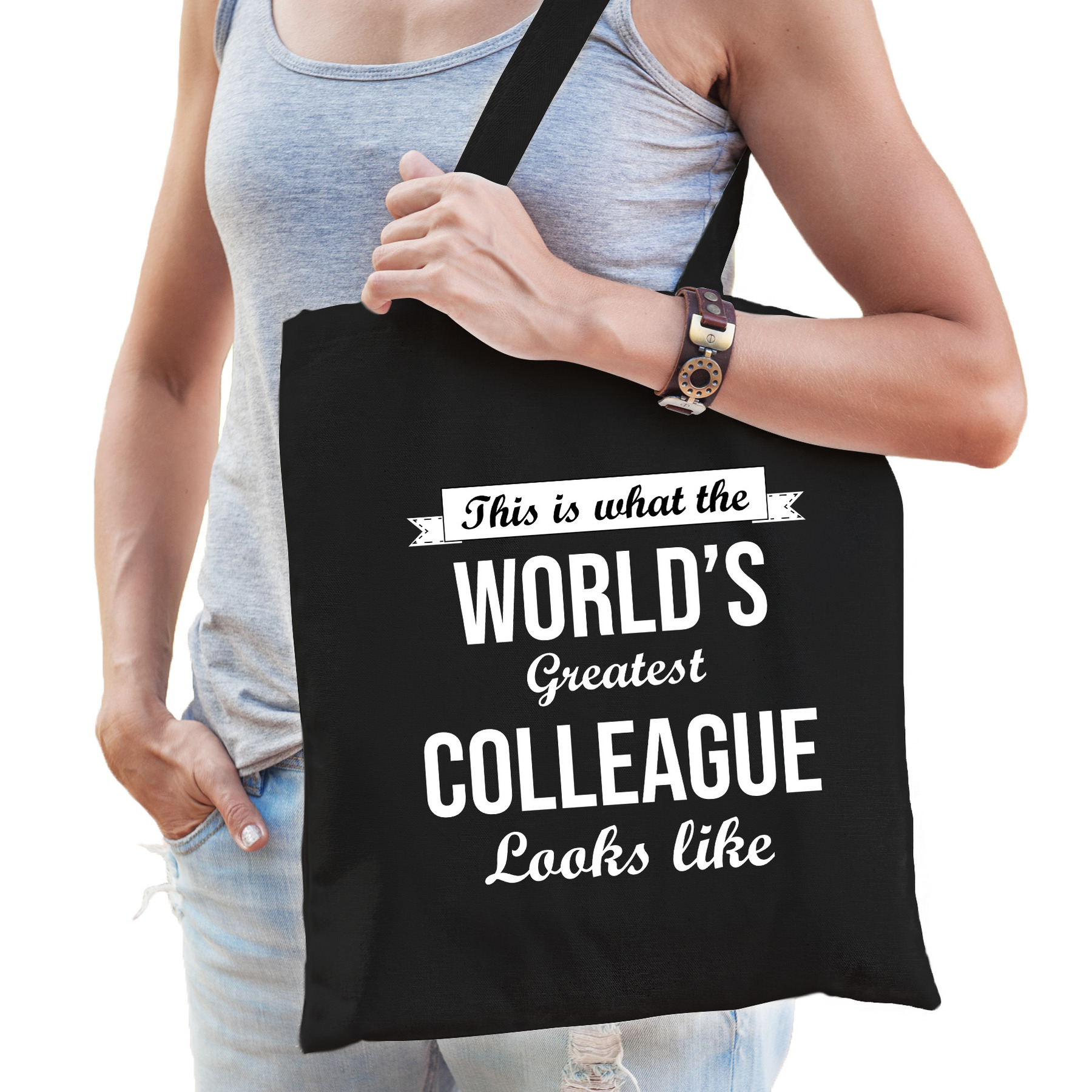 Worlds greatest COLLEAGUE cadeau tas zwart voor dames. Op dit zwarte collega kado tasje staat: This is what the world’s greatest COLLEAGUE looks like. Leuke kado tas voor een collega bijvoorbeeld voor haar verjaardag of om simpelweg te laten zien hoe blij u met haar bent.