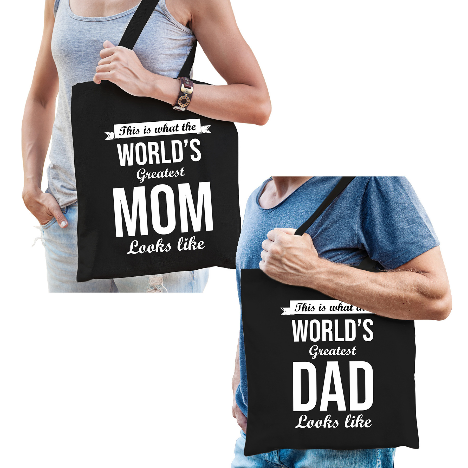 Worlds greatest Mom en Dad tasje – Cadeau tassen set voor Papa en Mama. Katoenen tasjes cadeau set voor papa en mama, bestaande uit 2 tassen uit dezelfde serie. Een leuke boodschappen tas voor je mama en voor papa! Koop in 1 keer een cadeau voor Moederdag en Vaderdag, voor hun verjaardagen of gewoon omdat ze de beste papa en mama zijn.