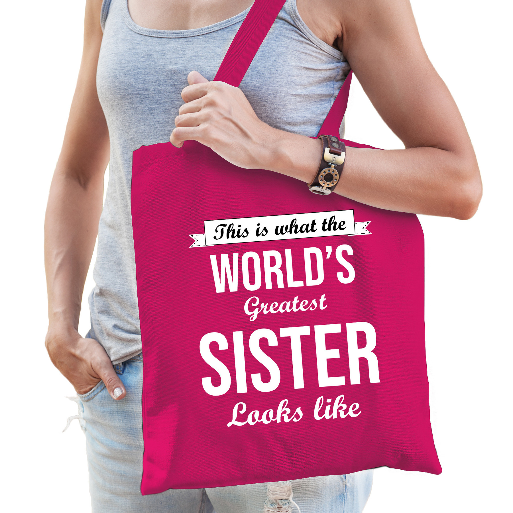 Worlds greatest SISTER cadeau tas fuchsia roze voor dames. Op dit roze kado tasje staat: This is what the world’s greatest SISTER looks like. Leuke tas voor een zus / zusje haar verjaardag of om simpelweg te laten zien hoeveel u om haar geeft.