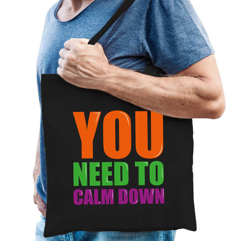 You need to calm down fun tekst kado katoenen tas zwart voor heren. Dit zwart katoenen tasje is eenzijdig bedrukt met de tekst: You need to calm down.