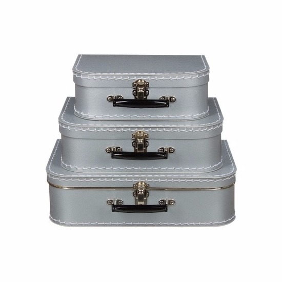 Kinderkoffertje zilver 25 cm. Klassiek model koffertje voor kinderen. Materiaal: stevig karton. Formaat: ongeveer 25 x 18 cm.