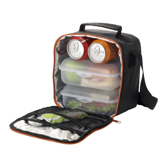 Vierkante koeltas zwart met oranje. Lunchtas met handige vakken voor snacks en 2 lunchboxen voor boterhammen of salade. Formaat: ongeveer 22,5 x 22 x 13 cm. Inhoud ongeveer: 6 liter.