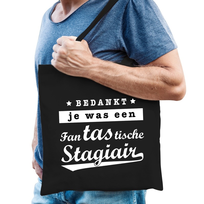 Katoenen stagiair kado tas / shopper met de tekst: bedankt je was een Fantastische stagiair in de kleur zwart voor heren. Deze tas / shopper is leuk om cadeau te geven aan het einde van een stage periode, verjaardag van een stagiair of gewoon zomaar. Dit zwarte katoenen tasje is eenzijdig bedrukt met de tekst: bedankt je was een Fantastische stagiair.