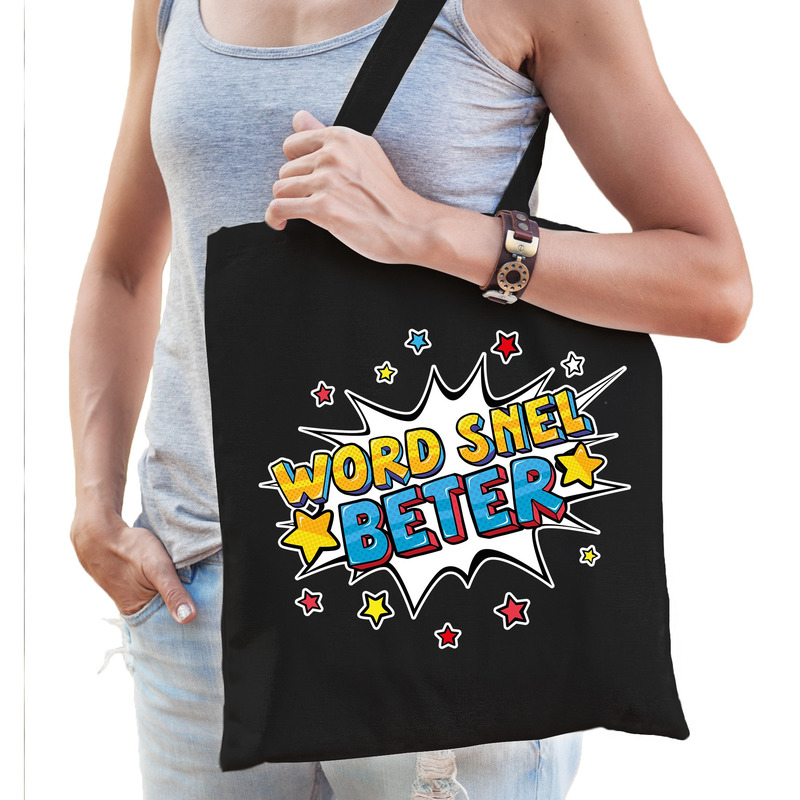 Dit zwart katoenen tasje is eenzijdig bedrukt met de tekst: Word snel beter.