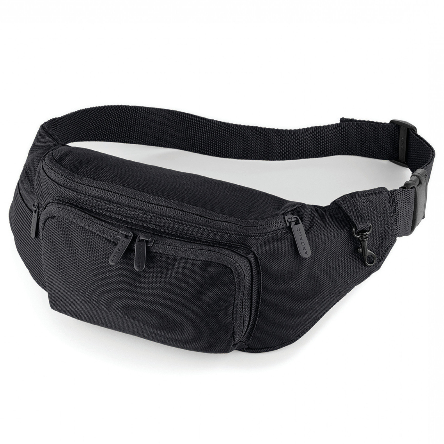 Zwarte comfortabele fanny pack/heuptas/buideltas met 3 vakken. Perfect voor het vervoer van onmisbare spullen. Voor wandelaars/sporters. De heuptas is voorzien van een verstelbare heupband, een sluithaak voor sleutels en verschillende zakken met ristsluiting. Het formaat is ca. 37 x 15 x 10 cm, inhoud: 2 liter. Materiaal: polyester.