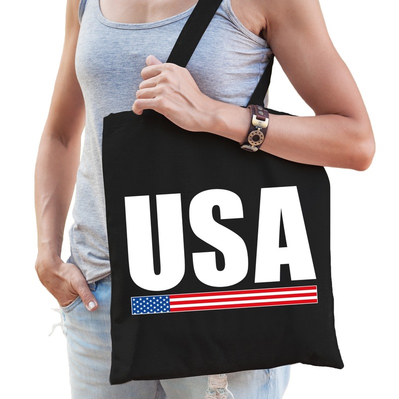 Katoenen Amerika supporter tasje: USA in de kleur zwart. Dit zwarte katoenen tasje is eenzijdig bedrukt met de tekst USA in de Amerikaanse kleuren.