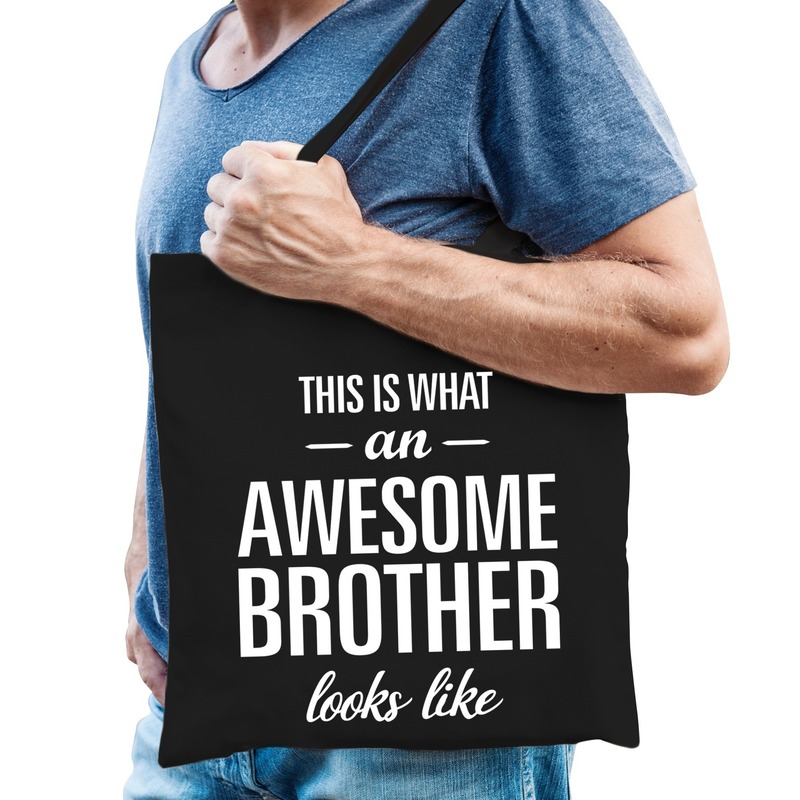 Katoenen cadeau tasje this is what an awesome brother looks like in de kleur zwart. Leuk cadeau idee voor een broer bijvoorbeeld als bedankje of als verjaardag cadeau. Dit zwarte katoenen tasje is eenzijdig bedrukt met de tekst This is what an awesome brother looks like.